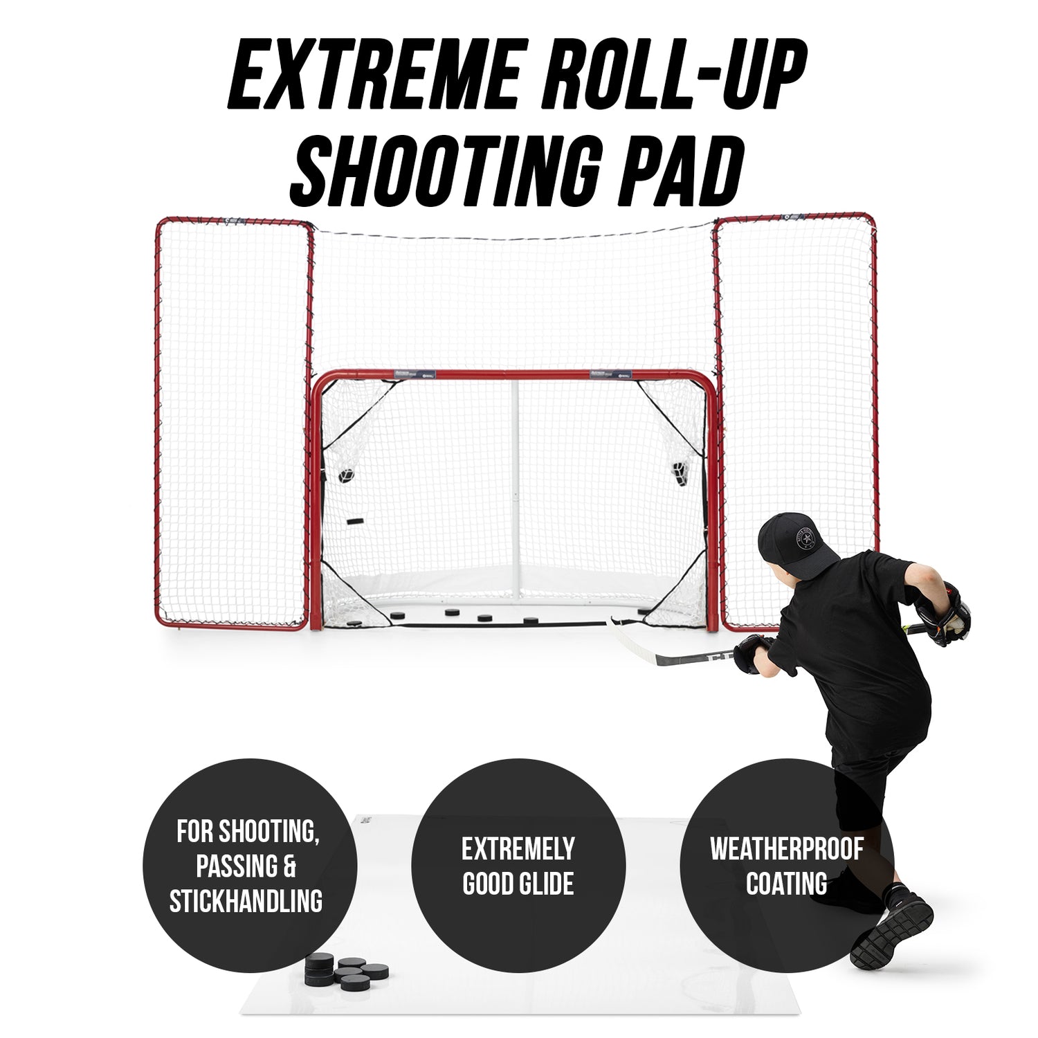 The Extreme Hockey Skills Kit is an amazing hockey training aid so you can practice shooting, passing and stickhandling like the pros in the NHL in your own home.Can be used indoors & outdoors. The huge 4.5’ x 10’ roll-up hockey shooting pad has amazing glide with regular pucks. The stickhandling trainer and the pro hockey passer are used by 100+ NHL players. Take your game to the next level with this amazing hockey training kit.